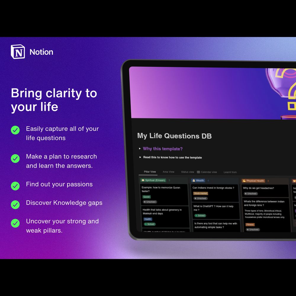 Unlock your full potential by capturing and solving life's burning questions with this customizable Notion template. Organize your thoughts, plan your research and find answers for personal and professional growth. Try it now and see the difference it can make in your life.