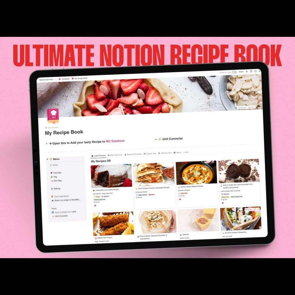 No more writing down your cooking and baking recipes on scratch pads or searching in browser bookmarks. Keep your recipes organized and find them easily with the Ultimate Notion Recipe Book. Tag recipes by meal types, cuisines, and more. Its $65 but am giving it you for FREE for a limited period! Enjoy